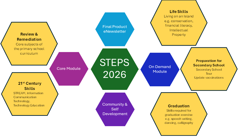 The STEPS programme will be implemented at primary schools during Term III of the academic year. Schools will design their own programme using resources provided by the MoE and partnering stakeholders.